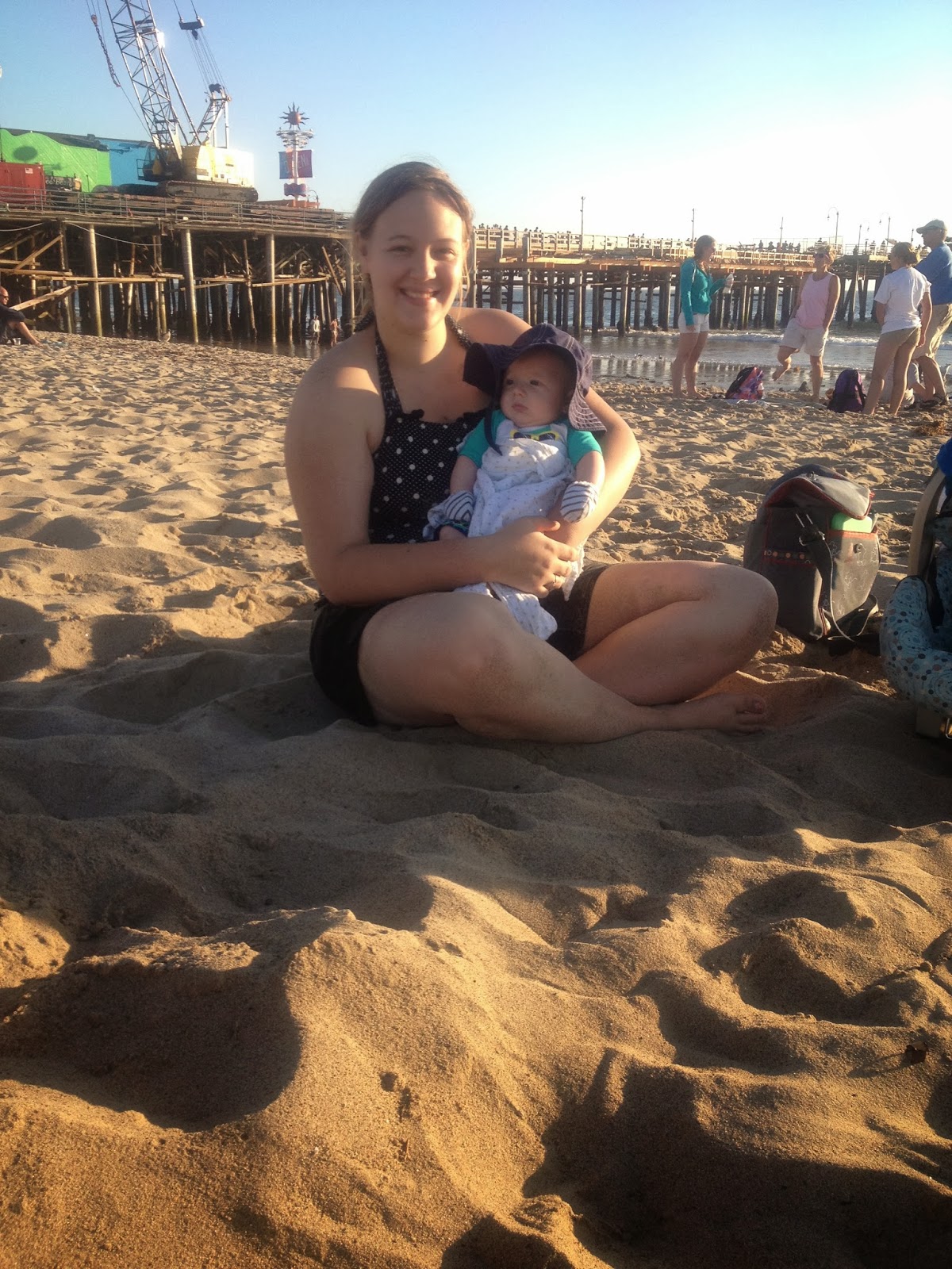Luke slept the whole night! However, Abbie woke up way to early. Thankfully she quietly played by herself until the rest of us woke up. We packed up, stopped at McDonald's for breakfast and then headed back on the road to California. We only took one break in Barstow to feed Luke. We reached the LA area in the afternoon, ate lunch and then met up with everyone else at Santa Monica beach. We had a blast playing in the ocean, and digging in the sand.